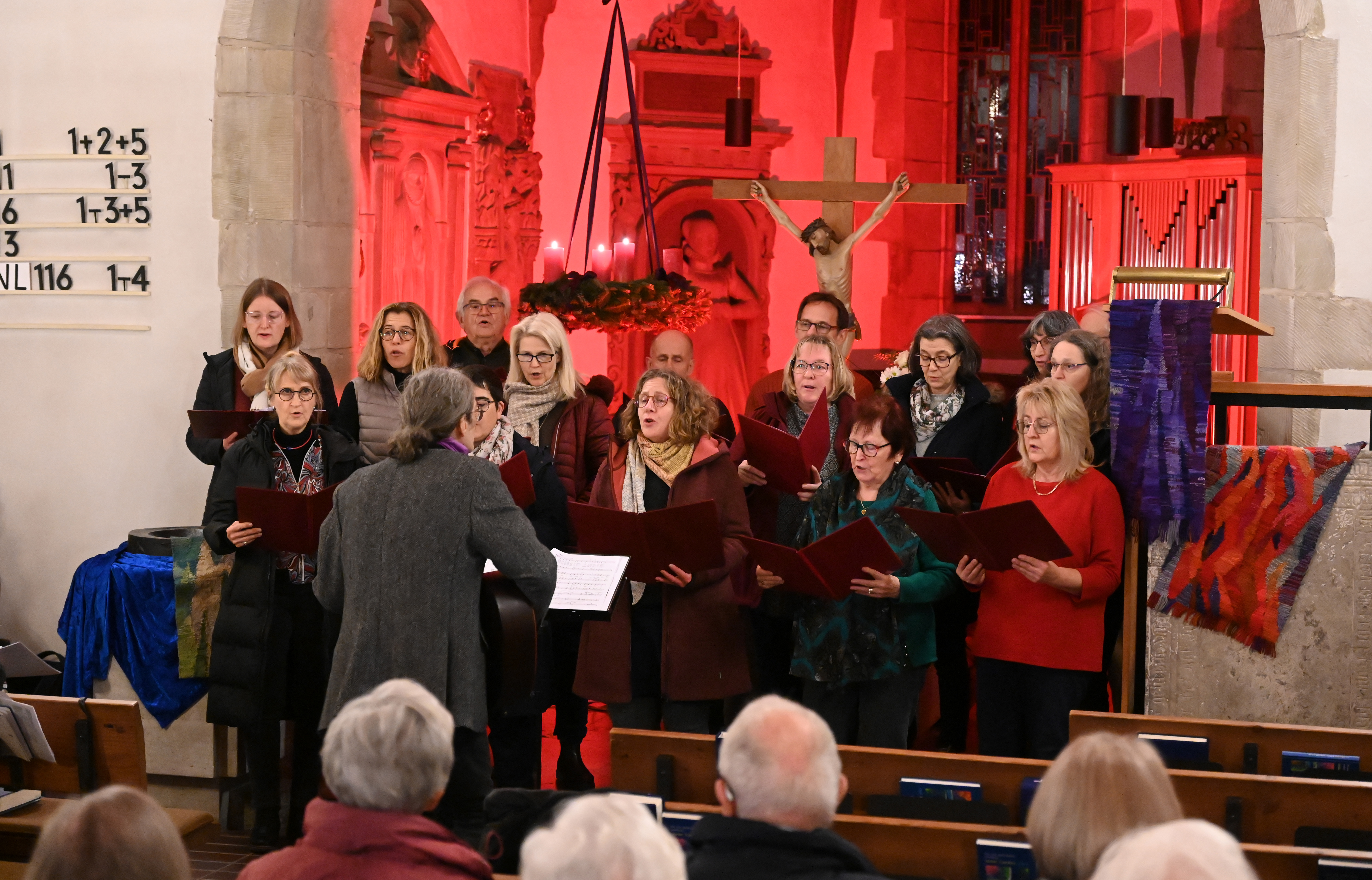 Eintauchen in eine berührende adventliche Farbenwelt durften die zahlreichen Feiernden des Spätlesegottesdienstes am 3. Advent in der Nikolauskirche. Dort war viel Wissens- und auch Nachdenkenswertes rund um die adventlich-liturgische Farbpalette rot, grün, violett, weiß und blau zu erfahren. Farblich passende Lichtprojektionen im Chorraum sorgten für optische, ein bestens gestimmter Spätlesechor für akustische Strahlkraft. Letzterer setzte Frank Schilling mit gefühlvollen Gitarrenklängen noch das Sahnehäubchen auf.