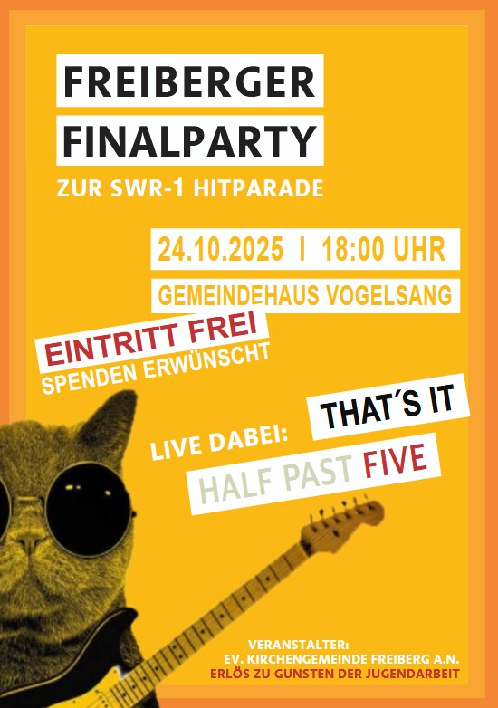 Ab Montag, 20. Oktober spielt SWR1 eine Woche lang rund um die Uhr die gewählten Lieblingssongs der Zuhörer und Zuhörerinnen im Radio! Freitags endet die Hitparade mit einem grossen Finale und Party. Zur Freiberger Finalparty laden wir ab 18 Uhr ins Gemeindehaus Vogelsang Stadtteil Heutingsheim zum Live-Stream in die Stuttgarter Schleyerhalle, Live-Acts mit THAT´S IT und HALF PAST FIVE und jeder Menge Spass und guter Laune....ein! Der Eintritt ist frei! Wir freuen uns aber über Spenden für die ev. Jugendarbeit in unserer Kirche … also kommen, tanzen, Spass haben, andere nette Menschen treffen... und Gutes tun! |