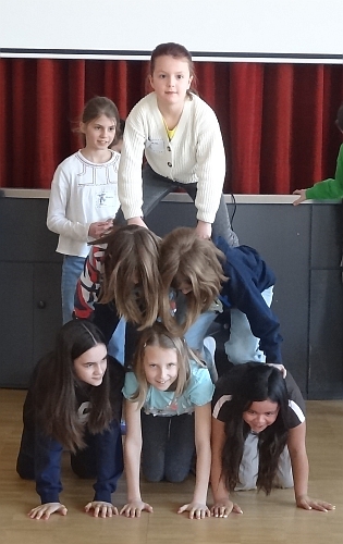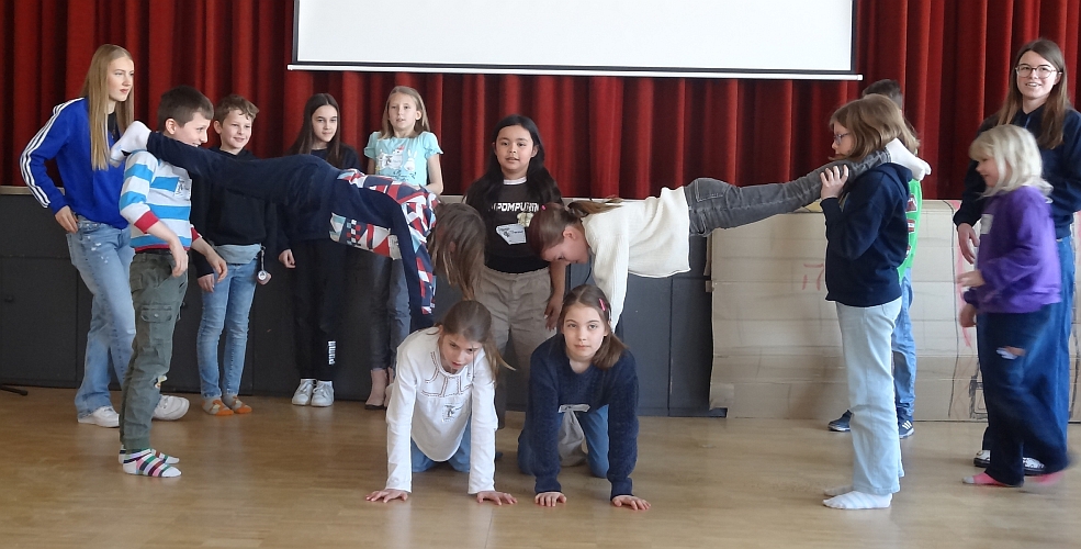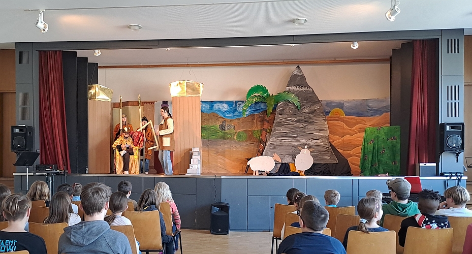 Beim Spielen dieser biblischen Theaterszenen brillierten, Marie und Helen als David und Jonathan. Oskar in der Rolle von König Saul. Herold, Diener, Soldaten und weitere Personen spielten Antonia, Lena, Gabriel, Ella, Hannah, Gabor, Philipp, Nic und Finn. Und als Rahmenpersonen tauchten immer wieder Filea vom fremden Planeten Alpha Karowasi gespielt von Mara und Moderator Patrick auf.