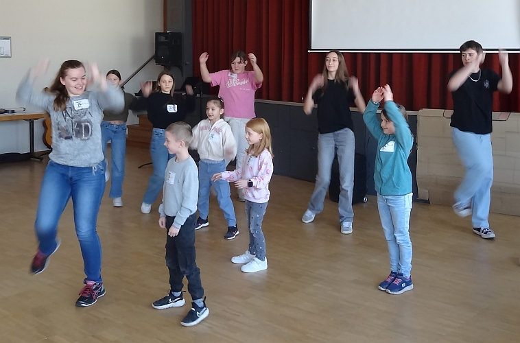 Gemeinsam sangen wir den Tag über mit Michaela Hartmann-Trummer am E-Piano, Patrick Fischer am Cajón, Hanna Cywinski an der Querflöte und André Pardes an der Gitarre voll Freude die zwanzig Lieder der Kinderferientage.