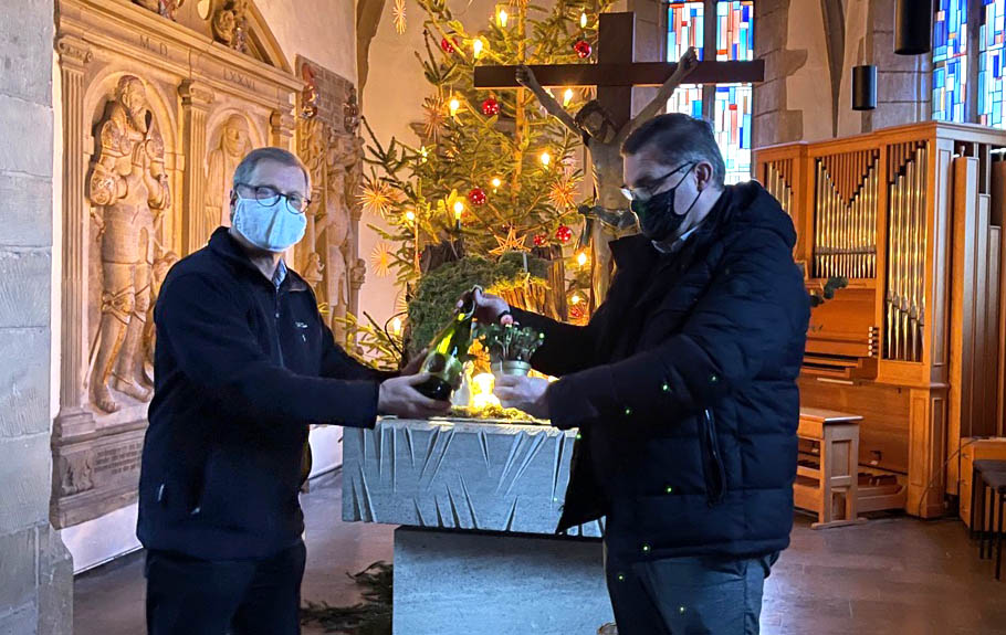 Nachdem, abgesehen von unserem Ökumenejubiläum im Februar, alle Planungen zu gemeinsamen Gottesdiensten und Veranstaltungen im letzten Jahr der Pandemie zum Opfer fielen, wollte Pfarrer Schwab mit seinem Besuch auch ein kleines Zeichen setzen, dass die katholische Kirchengemeinde uns nicht vergessen hat. Vielmehr wünscht sie ihren evangelischen Glaubensgeschwistern in Freiberg ein gutes und gesegnetes neues Jahr. Diesen Wunsch geben wir an dieser Stelle gerne an Sie weiter.